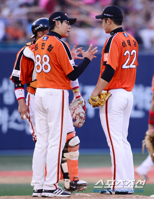 | 인천아시안게임 대표팀에 뽑힌 이태양은 29일 넥센전에서 최악의 부진을 보이며 패전투수가 됐다. 2회말 이태양이 난조를 보이자 정민철 투수코치가 마운드로 올라가 조언을 하고 있다. 목동=조병관기자 rainmaker@sportschosun.com |
