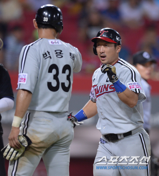 24일 오후 광주 기아챔피언스필드에서 2014 프로야구 LG와 KIA의 경기가 열렸다. 8회초 1사 1,2루서 LG 이병규가 중월 3점 홈런을 친 후 홈에서 박용택과 하이파이브를 나누고 있다. 광주=김경민 기자 kyungmin@sportschosun.com / 2014.07.24.