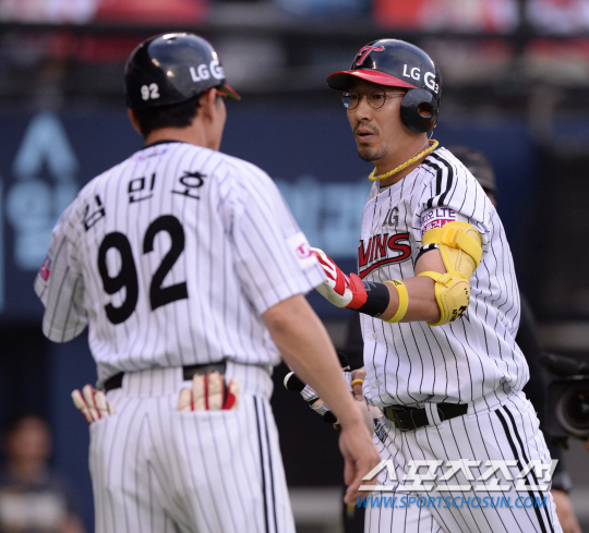 1일 오후 서울 잠실야구장에서 2014 프로야구 넥센과 LG의 경기가 열렸다. 1회말 무사서 LG 정성훈이 좌중월 솔로홈런을 친 후 홈에서 김민호 코치와 하이파이브를 나누고 있다. 잠실=김경민 기자 kyungmin@sportschosun.com