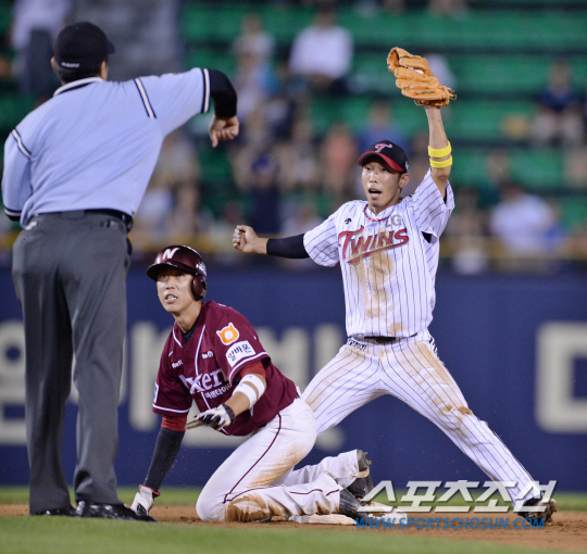 1일 오후 서울 잠실야구장에서 2014 프로야구 넥센과 LG의 경기가 열렸다. 9회초 무사 1루서 1루주자 유재신이 유한준 타석 때 2루 도루에 실패하고 있다. 염경엽 감독은 곧바로 합의 판정을 요청했으나 아웃으로 판독되었다. 잠실=김경민 기자 kyungmin@sportschosun.com / 2014.08.01.
