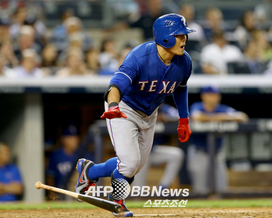 | 텍사스 레인저스 추신수가 4일(이하 한국시각) 클리블랜드 인디언스와의 경기에서 5타수 무안타에 그쳤다. 지난달 22일 뉴욕 양키스전에서 6회 안타를 치고 나가고 있는 추신수. ⓒAFPBBNews = News1 |