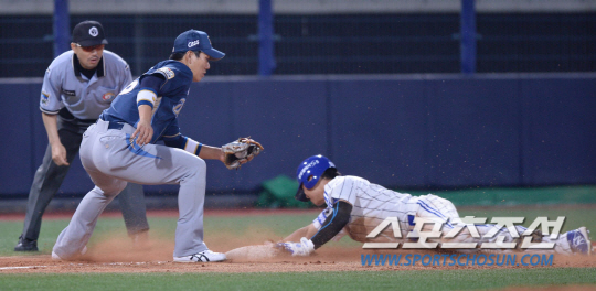 27일 오후 포항 종합운동장 야구장에서 2014 프로야구 NC와 삼성의 경기가 열렸다. 4회말 2사 1루서 1루주자 김헌곤이 이지영의 우전 안타 때 3루서 세이프되고 있다. 포항=김경민 기자 kyungmin@sportschosun.com