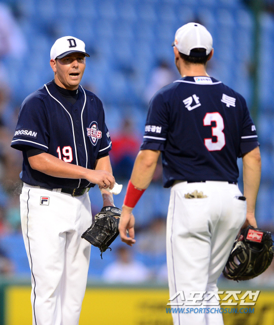 프로야구 한화와 두산이 1일 대전 한밭구장에서 주말 3연전 경기를 펼쳤다. 시리즈 첫 경기에는 한화는 타투스코를 두산은 마야를 내세워 용병투수 맞대결을 펼쳤다. 한국프로야구에 데뷔 무대를 갖고 있는 두산 마야가 3회 연속안타를 허용하며 4실점 했다. 연속 실점을 허용하고 칸투와 대화를 나누고 있는 마야(왼쪽). 대전=송정헌 기자 songs@sportschosun.com/2014.08.01 |