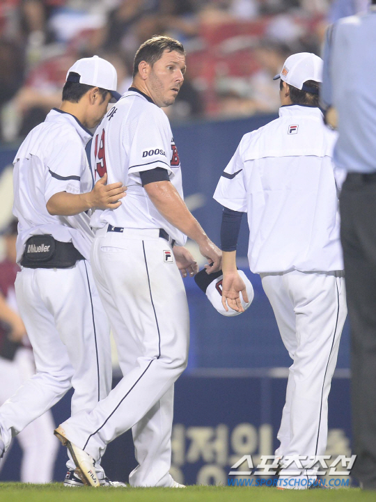 2014 프로야구 두산베어스와 넥센 히어로즈스의 경기가 7일 잠실야구장에서 열렸다. 넥센 5회초 선두타자 유한준 타석때 두산 선두타자 마야가 갑작스런 손목통증을 호소하며 교체되고 있다. 잠실=최문영 기자 deer@sportschosun.com /2014.08.07/ |