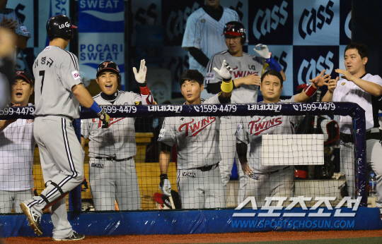 LG 트윈스와 NC 다이노스의 2014 프로야구 경기가 7일 마산구장에서 열렸다. 7회초 무사 1루 LG 이병규가 좌월 동점 투런포를 치고 들어와 동료들의 축하를 받고 있다. 마산=정재근 기자 cjg@sportschosun.com/2014.08.07/ |