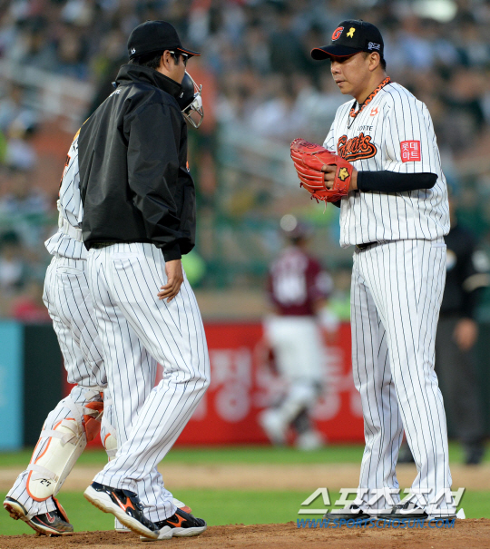 롯데와 넥센의 주말 3연전 첫번째 경기가 16일 부산 사직구장에서 열렸다. 롯데 김사율이 2회초 넥센 로티노를 볼넷으로 출루시키며 2사 만루의 위기를 맞자 정민태 투수코치가 마운드로 올라와 이야기를 하고 있다. 부산=허상욱 기자 wook@sportschosun.com/2014.05.16/ |