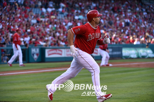 메이저리그 LA 에인절스의 강타자 앨버트 푸홀스가 연장 19회 승부에 마침표를 찍었다. 끝내기 솔로 홈런을 쳤다. ⓒAFPBBNews = News1 |