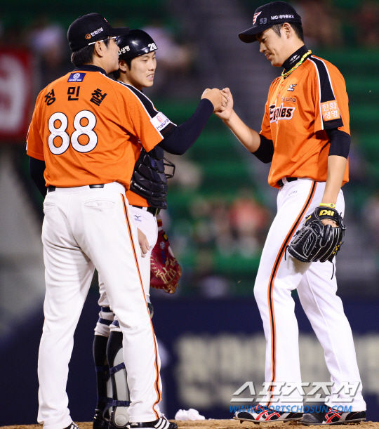 전날 우천취소로 연기된 LG와 한화의 경기가 11일 월요일 잠실 야구장에서 펼쳐 졌다. 한화 선발 이태양이 7회 1사후 LG 스나이더에게 안타를 허용하자 정민철 투수코치가 마운드에 올라 강판 시키고 있다. 최근 부진에 빠졌던 이태양은 이날 경기에서 완벽에 가까운 투구로 부활을 알렸다. 잠실=조병관기자 rainmaker@sportschosun.om/2014.08.11/