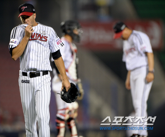 LG와 SK의 주중 2연전 첫번째 경기가 12일 잠실구장에서 열렸다. LG 티포드가 4회초 1사 만루 SK 박정권이 우익수 오른쪽으로 흐르는 2타점 2루타를 허용한 후 마운드를 내려가고 있다. 잠실=허상욱 기자 wook@sportschosun.com