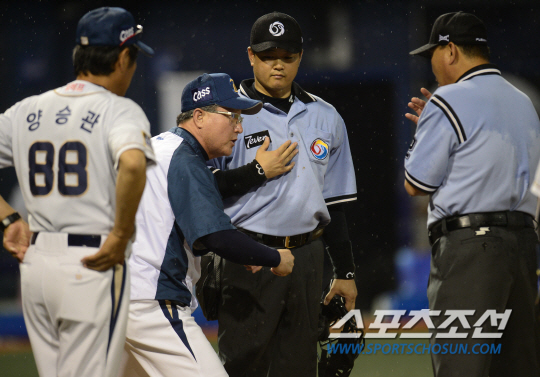 LG 트윈스와 NC 다이노스의 2014 프로야구 경기가 7일 마산구장에서 열렸다. 6회말 2사 2루 NC 박민우의 좌익수앞 안타 때 2루주자 지석훈이 홈까지 뛰었지만 최경철의 블로킹을 피해 홈베이스 터치를 시도하다 태그아웃됐다. NC 김경문 감독이 최경철이 홈베이스를 미리 막은 것에 대해 주루방해가 아니냐며 항의하고 있다. 마산=정재근 기자 cjg@sportschosun.com/2014.08.07/