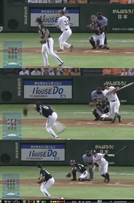 오승환은 초노 히사요시에게는 4구째에 바깥쪽 낮은 코스로 떨어지는 시속 143㎞ 컷패스트볼을 던졌고, 초노의 방망이는 헛돌았다.