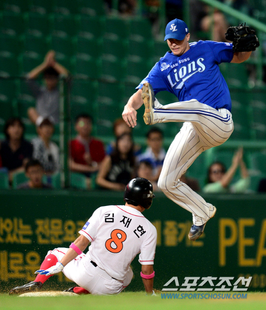 삼성 라이온즈와 SK 와이번스의 2014 프로야구 경기가 14일 인천구장에서 열렸다. 7회말 1사 2루 SK 김성현의 3루수 땅볼 때 2루주자 김재현이 1루로 공이 송구되는 틈을 타 3루까지 진루하고 있다. 3루 백업을 들어간 마틴이 크게 점프하며 송구된 공을 잡고 있다. 인천=정재근 기자 cjg@sportschosun.com/2014.08.14/ |
