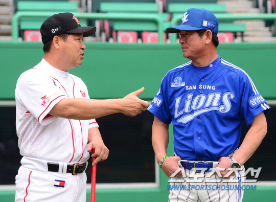 류중일 감독이 이만수 감독의 연속 합의판정 성공을 축하했다. 삼성 라이온즈와 SK 와이번스의 2014 프로야구 경기가 14일 인천구장에서 열리는 가운데 삼성 류중일 감독과 SK 이만수 감독이 경기 전 만나 이야기를 나누고 있다. 류 감독은 전날 두 번의 연속 합의판정 번복에 성공한 이 감독을 축하하며 합의판정 제도에 대해 이야기를 나눴다. 한편, 이 감독은 13일 잠실 LG전에서 4회초 결정적인 연속 합의판정 성공으로 경기 흐름을 단숨에 바꾸며 8대5 승리를 이끌었다. 인천=정재근 기자 cjg@sportschosun.com