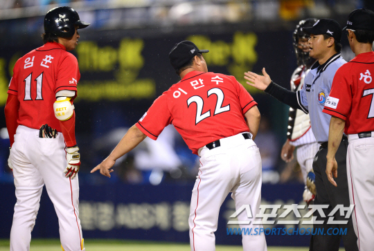 SK 이만수 감독은 12일까지 딱 한번 합의판정을 신청했다. 그것도 홈런에 대한 것이어서 아웃-세이프와 관련된 합의판정은 한번도 신청하지 않은 셈이다. 그랬던 이 감독이 한 타석에 두번의 합의판정을 연달아 모두 쓰면서 경기의 흐름을 바꿔 놓았다. 13일 잠실 LG전서 1-3으로 뒤진 4회초 2사 1루서 이 감독의 승부수가 통했다. 임 훈 타석 때 1루주자 나주환이 2루도루를 시도했는데 아웃 판정이 났다. 이닝이 종료되는 상황. 이 감독이 득달같이 달려나와 합의판정을 신청했다. 사실 2사후인 상황이라 나주환이 세이프가 되더라도 득점으로 연결할지를 장담할 수 없었다. 하지만 이 감독은 세이프를 확신했고 초접전의 상황이었지만 나주환의 발이 2루에 먼저 닿았다. 세이프. 덕아웃으로 들어갔던 LG 선수들은 다시 그라운드로 나섰다. 마운드에 선 LG 선발 류제국은 임 훈에게 몸쪽 공을 던졌다. 임 훈은 다리에 스쳤다고 주장했지만 주심은 받아들이지 않았다. 이 감독이 다시 나와 합의판정을 신청했다. 합의판정후 다음 플레이에서 곧바로 합의판정을 신청한 경우는 처음이었다. TV리플레이 결과 임훈의 오른쪽 다리를 스쳐 유니폼이 움직이는 것이 보여 사구가 인정됐다. 2사 1,2루서 정상호가 좌전안타를 쳐 1점을 만회한 SK는 상대 폭투로 된 2사 2,3루서 한동민의 우전안타가 터지며 4-3으로 역전까지 했다. 이어진 조동화의 땅볼도 발이 더 빨라보였지만 판정은 아웃. 이 감독이 다시 덕아웃 앞으로 달려나왔지만 2번의 기회를 모두 쓴 탓에 아쉬운 쓴웃음만 지었다. 류제국은 결국 5회 무너졌고 승부는 SK로 기울었다.