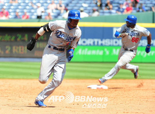 | 9회초 아드리안 곤잘레스의 2루타 때 홈까지 내달리고 있는 디 고든. ⓒAFPBBNews = News1 |