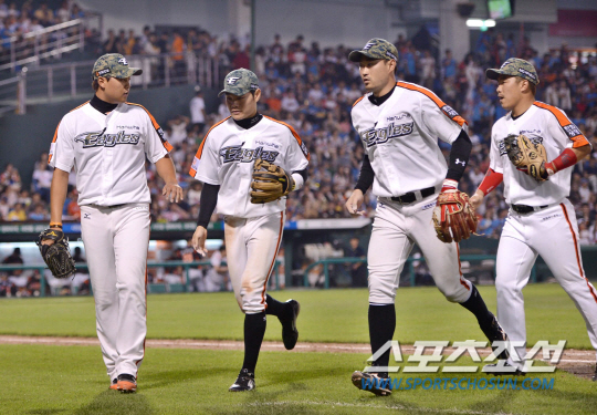 14일 오후 대전 한밭야구장에서 2014 프로야구 롯데와 한화의 경기가 열렸다. 4회초 1사 1루서 롯데 정훈을 병살처리 한 한화 유창식(맨 왼쪽)이 내야진과 하이파이브를 나누고 있다. 대전=김경민 기자 kyungmin@sportschosun.com