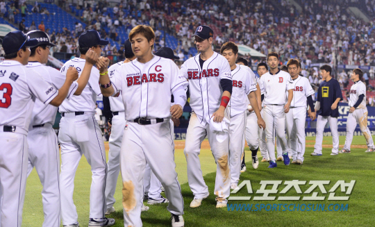 16일 잠실구장에서 4강 경쟁을 펼치고 있는 두산과 롯데의 2연전 첫 번째 경기가 열렸다. 두산이 롯데에 9대2로 승리했다. 경기 종료 후 하이파이브를 나누고 있는 두산 선수들. 잠실=송정헌 기자 songs@sportschosun.com/2014.08.16 |