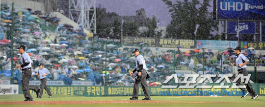 17일 오후 대구 시민야구장에서 2014 프로야구 LG와 삼성의 경기가 열렸다. 3회초 LG의 공격이 끝난 후 우천으로 인해 심판진이 경기 중단을 선언한 후 그라운드를 떠나고 있다. 대구=김경민 기자 kyungmin@sportschosun.com / 2014.08.17