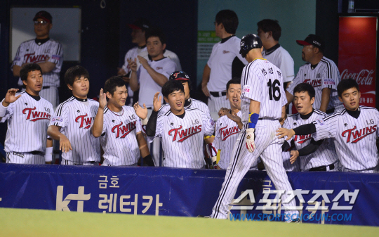 SK 와이번스와 LG 트윈스의 2014 프로야구 경기가 13일 잠실구장에서 열렸다. 3회말 2사 1,2루 이진영의 중견수 앞 안타 때 2루주자 정성훈이 홈인한 후 덕아웃 동료들의 축하를 받고 있다. 잠실=정재근 기자 cjg@sportschosun.com/2014.08.13/