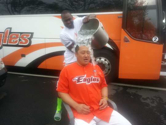 한화 이글스 주전 포수 조인성이 19일 울산 롯데전을 앞두고 얼음물을 뒤집어썼다.
