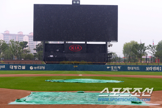 2일 광주 챔피언스필드에서 프로야구 KIA와 두산의 주중 두 번째 경기가 열릴 예정이었으나 우천으로 취소됐다. 비가 내리는 챔피언스필드에 방수포가 깔려있다. 광주=송정헌 기자 songs@sportschosun.com/2014.07.02 |