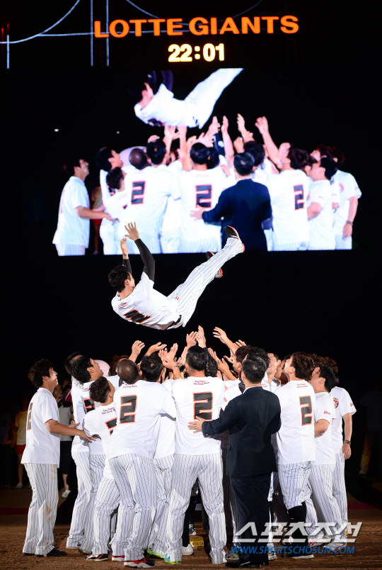 롯데 자이언츠의 '영원한 캡틴' 조성환이 23일 부산 사직구장에서 은퇴식을 가졌다. 조성환이 동료들의 행가레를 받고 있다. 부산=최문영 기자 deer@sportschosun.com /2014.08.23/ |