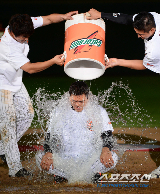 롯데 자이언츠의 '영원한 캡틴' 조성환이 23일 부산 사직구장에서 은퇴식을 가졌다. 조성환이 은퇴식중 황재균과 정훈의 도움을 받아 아이스버킷 챌린지에 동참하고 있다. 부산=최문영 기자 deer@sportschosun.com /2014.08.23/ |