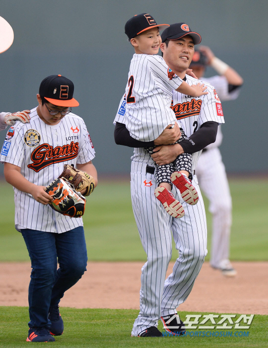 2014 프로야구 롯데자이언츠와 LG트윈스의 경기가 23일 부산사직야구장에서 열렸다. 은퇴식을 앞둔 롯데 조성환이 시타와 시구를 마친 자신의 두아들과 그라운드를 나서고 있다. 부산=최문영 기자 deer@sportschosun.com /2014.08.23/ |