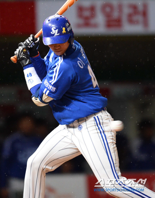 2014 프로야구 SK와이번즈와 삼성라이온스의 경기가 7일 인천문학야구장에서 열렸다. 삼성 9회초 1사 만루에서 이흥련이 몸에 맞는 볼로 밀어내기 타점을 올리고 있다. 문학=최문영 기자 deer@sportschosun.com /2014.05.07/ |
