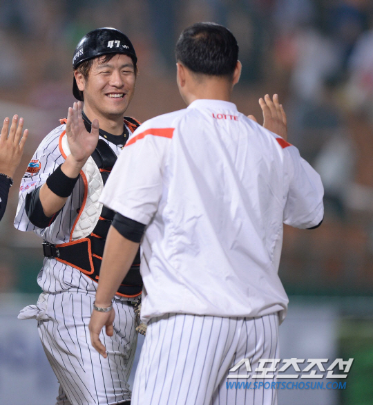27일 오후 부산 사직구장에서 2014 프로야구 롯데와 NC의 경기가 열렸다. 8대7로 승리한 후 롯데 강민호가 송승준과 하이파이브를 나누고 있다. 부산=김경민 기자 kyungmin@sportschosun.com / 2014.06.27.