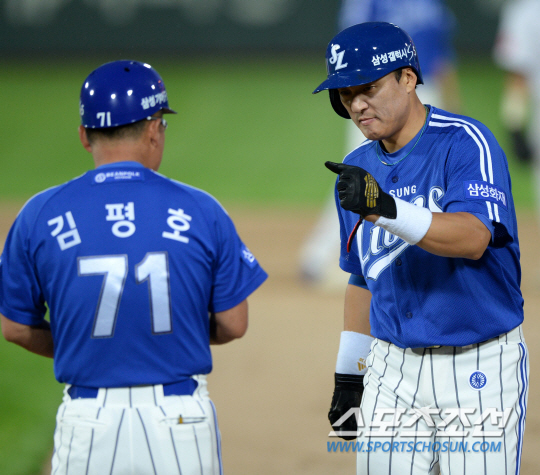| 롯데와 삼성의 주중 2연전 첫번째 경기가 26일 부산 사직구장에서 열렸다. 1회초 2사 1,2루 삼성 이승엽이 중견수 앞 1타점 적시타를 치고 김평호 1루 코치와 하이파이브를 하고 있다. 부산=허상욱 기자 wook@sportschosun.com/2014.08.26/ |