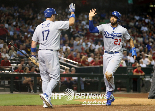 | LA 다저스 맷 켐프가 27일(한국시각) 애리조나전에서 4회초 득점을 올린 뒤 A.J. 엘리스와 하이파이브를 하고 있다. 다저스는 9대5로 승리했다. ⓒAFPBBNews = News1 |