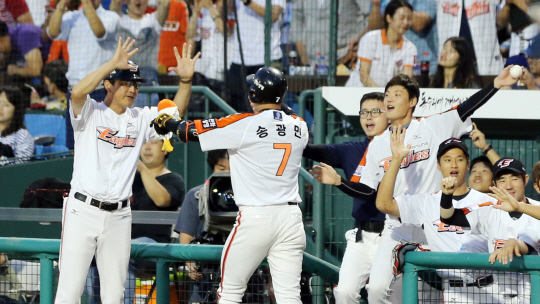 | 2회말 만루홈런을 터트린 한화 송광민이 덕아웃 앞에서 동료들과 하이파이브를 하고 있다. 사진제공=한화 이글스 |