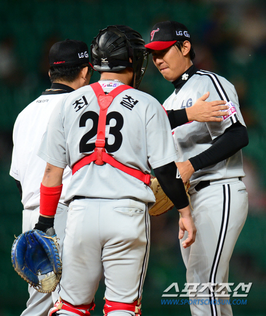 LG 트윈스와 SK 와이번스의 2014 프로야구 경기가 28일 인천구장에서 열렸다. 4회말 무사 1,2루 SK 김강민 타석 때 LG 양상문 감독이 올라와 직접 장진용을 강판시키고 있다. 인천=정재근 기자cjg@sportschosun.com