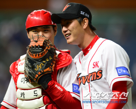 LG 트윈스와 SK 와이번스의 2014 프로야구 경기가 28일 인천구장에서 열렸다. 7회초 2사 손주인을 플라이로 잡으며 7이닝 1실점의 호투를 펼친 김광현이 마운드를 내려오며 이재원 포수와 이야기를 나누고 있다. 인천=정재근 기자cjg@sportschosun.com/2014.08.28/