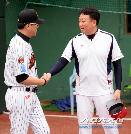 "수비에서 승부가 갈렸다." KIA 타이거즈가 3연패를 당했다. KIA는 8위로 한 계단 내려앉았다. KIA와 9위 한화 이글스의 승차는 1.5게임이다. 28일 부산 사직구장에서 롯데와 KIA의 주중 2연전 첫번째 경기가 예정된 가운데 양팀 선수들이 훈련을 펼쳤다. 롯데 김시진 감독과 KIA 선동열 감독이 만나 인사를 나누고 있다. 부산=허상욱 기자 wook@sportschosun.com/2014.08.28/ |