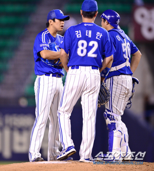 28일 오후 서울 잠실야구장에서 2014 프로야구 삼성과 두산의 경기가 열렸다. 5회말 무사 1루서 두산 김현수에게 우전안타를 허용한 삼성 윤성환이 마운드에 오른 김태한 코치와 이야기를 나누고 있다. 김경민 기자 kyungmin@sportschosun.com/ 2014.08.27. |