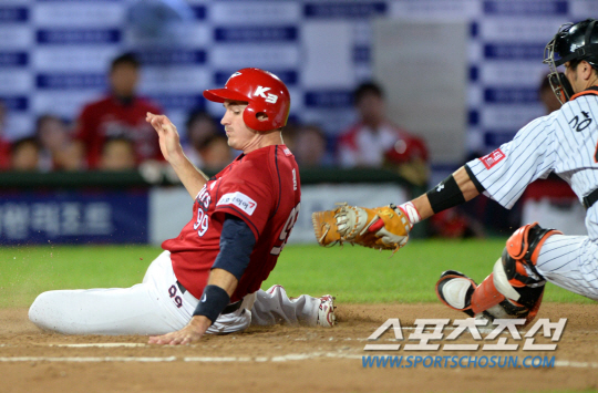 롯데의 KIA의 주중 2연전 두번째 경기가 29일 부산 사직구장에서 열렸다. 4회초 2사 1,2루 KIA 안치홍의 적시타때 2루주자 필이 홈으로 파고들고 있다. 나광남 주심은 아웃을 선언했고 이에 선동열 감독이 합의판정을 요청했다. 주심의 합의판정 결과는 세이프였다. 부산=허상욱 기자 wook@sportschosun.com/2014.08.29/ |