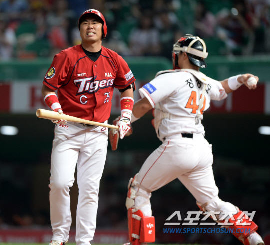 SK와 KIA의 주중 2연전 첫번째 경기가 7일 인천 문학구장에서 열렸다. 6회초 KIA 이범호가 SK 벤와트의 투구에 헛스윙 삼진으로 물러나며 아쉬워하고 있다. 인천=허상욱 기자 wook@sportschosun.com/2014.08.07/ |