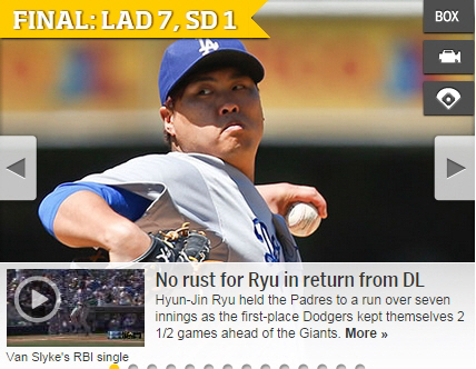MLB 홈페이지는 'DL에서 복귀한 류현진이 녹슬지 않은 기량을 선보였다'는 제목으로 류현진의 14승 소식을 프런트에 배치했다.