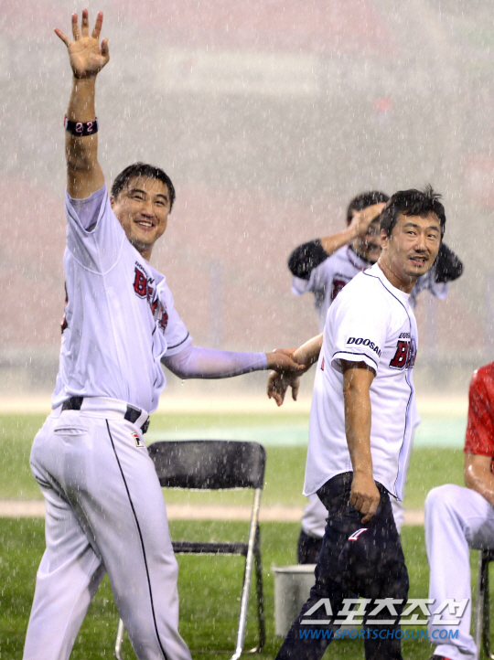 26일 서울 잠실야구장에서 열릴 예정이었던 2014 프로야구 LG와 두산의 경기가 우천 취소되었다. 경기가 취소되자 두산 홍성흔이 아이스버킷 챌린지를 위해 배우 류승수를 그라운드로 끌고 나오고 있다. 잠실=김경민 기자 kyungmin@sportschosun.com / 2014.08.26. |