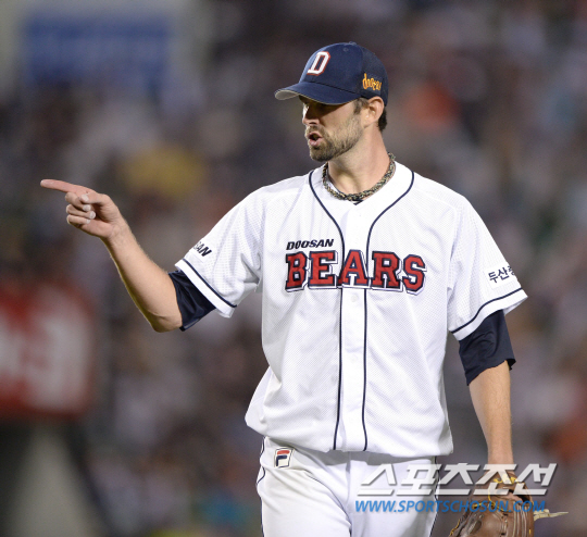 16일 잠실구장에서 4강 경쟁을 펼치고 있는 두산과 롯데의 2연전 첫 번째 경기가 열렸다. 두산 니퍼트와 롯데 장원준이 선발 맞대결을 펼쳤다. 두산 니퍼트가 4회 2사 2,3루에서 롯데 정훈을 삼진으로 처리하며 위기를 넘겼다. 최재훈 포수를 가리키고 있는 니퍼트. 잠실=송정헌 기자 songs@sportschosun.com/2014.08.16 |