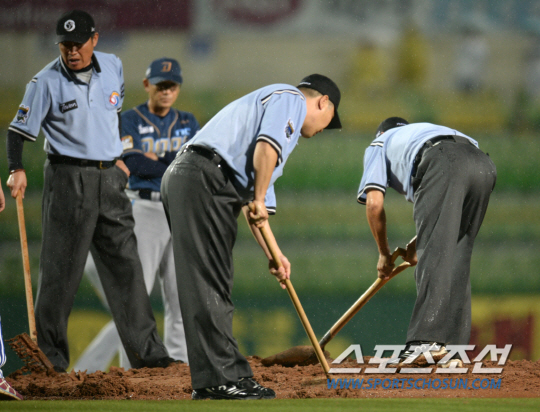 | 4연패 중인 NC와 5연패 중인 삼성이 만났다. 2일 대구구장에서 2014 프로야구 NC와 삼성의 경기가 열렸다. 9회말 빗줄기가 점점 굵어져 마운드가 진흙으로 변하자 심판들이 삽과 괭이를 들고 응급처치를 하고 있다. 대구=정재근 기자cjg@sportschosun.com/2014.09.02/ |