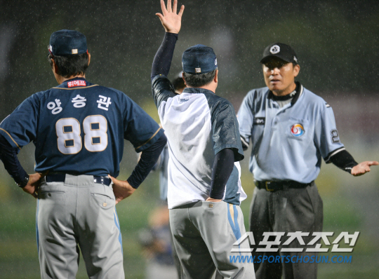 | 4연패 중인 NC와 5연패 중인 삼성이 만났다. 2일 대구구장에서 2014 프로야구 NC와 삼성의 경기가 열렸다. 9회말 NC가 NC가 10-8로 앞선 가운데 빗방울이 점점 굵어지자 김경문 감독이 나와 심판에게 경기를 중단해야 하는게 아니냐며 항의하고 있다. 대구=정재근 기자cjg@sportschosun.com/2014.09.02/ |