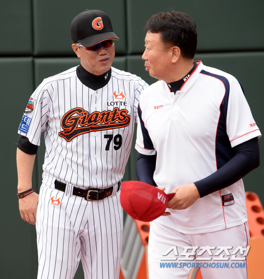 28일 부산 사직구장에서 롯데와 KIA의 주중 2연전 첫번째 경기가 예정된 가운데 양팀 선수들이 훈련을 펼쳤다. 롯데 김시진 감독과 KIA 선동열 감독이 만나 인사를 나누고 있다. 부산=허상욱 기자 wook@sportschosun.com/2014.08.28/ |
