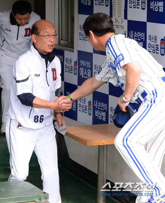 삼성라이온즈 류중일 감독이 21일 대구시민운동장 야구장에서 열릴 예정인 두산베어스와의 경기를 송일수 감독을 찾아 인사하고 있다. 대구=최문영 기자 deer@sportschosun.com /2014.08.21/ |