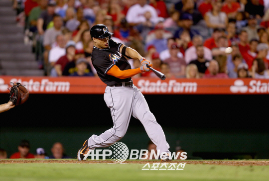 | 마이애미 말린스의 지안카를로 스탠튼은 4일(이하 한국시각) 현재 36홈런으로 볼티모어 오리올스의 넬슨 크루스와 함께 메이저리그 홈런 공동 1위를 달리고 있다. 지난달 26일 LA 에인절스전에서 4회 3점홈런을 날리고 있는 스탠튼. ⓒAFPBBNews = News1 |