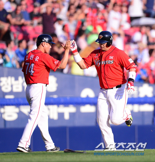 6일 오후 서울 잠실야구장에서 2014 프로야구 SK와 두산의 경기가 열렸다. 2회초 2사 만루서 SK 정상호가 좌중월 만루홈런을 친 후 조원우 코치와 하이파이브를 나누고 있다. 잠실=김경민 기자 kyungmin@sportschosun.com / 2014.09.06. |