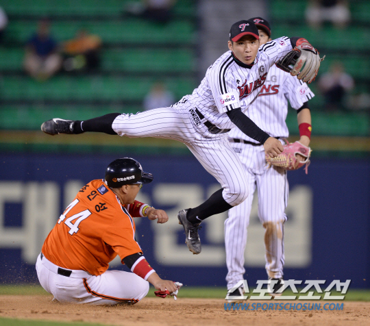 3일 오후 서울 잠실야구장에서 2014 프로야구 한화와 LG의 경기가 열렸다. 8회초 1사 1,2루서 1루주자 조인성이 이용규의 내야 땅볼 때 2루서 아웃되고 있다. LG 유격수는 오지환 잠실=김경민 기자 kyungmin@sportschosun.com / 2014.07.03. |