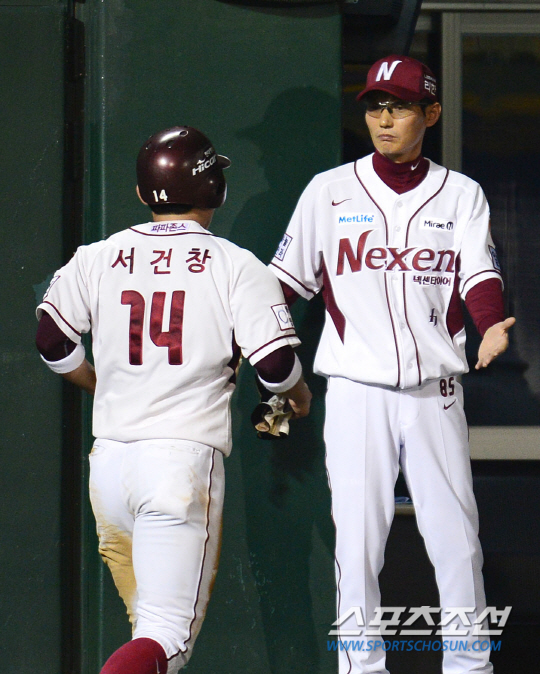 KIA 타이거즈와 넥센 히어로즈의 2014 프로야구 경기가 27일 목동구장에서 열렸다. 5회말 무사 2루 넥센 이택근의 안타 때 2루주자 서건창이 KIA 중견수 김다원의 실책을 틈타 홈인했다. 염경엽 감독이 서건창을 맞이하고 있다. 목동=정재근 기자cjg@sportschosun.com